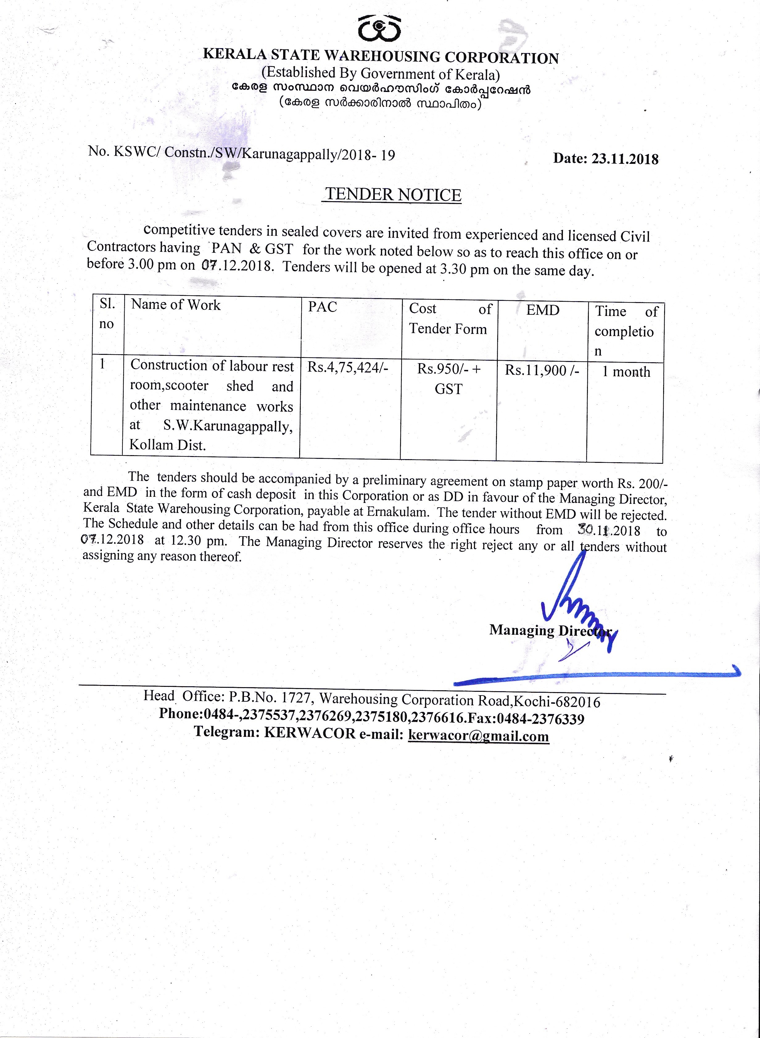 - "Re-Tender Notice for the Construction of labour shed, scooter shed and other maintenance works at S.W.Karunagappally" Time Extended upto 15.01.2019